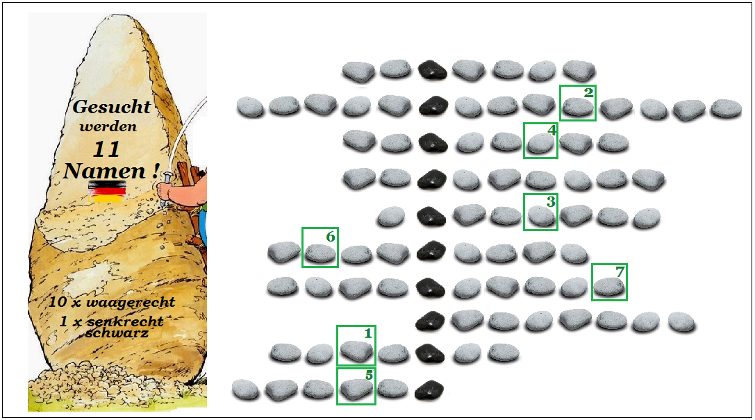 Die grün markierten Steine (1-7) ergeben seinen Namen hier: Er ist ein echter Dauerbrenner und hat sich wahrlich gut gehalten.