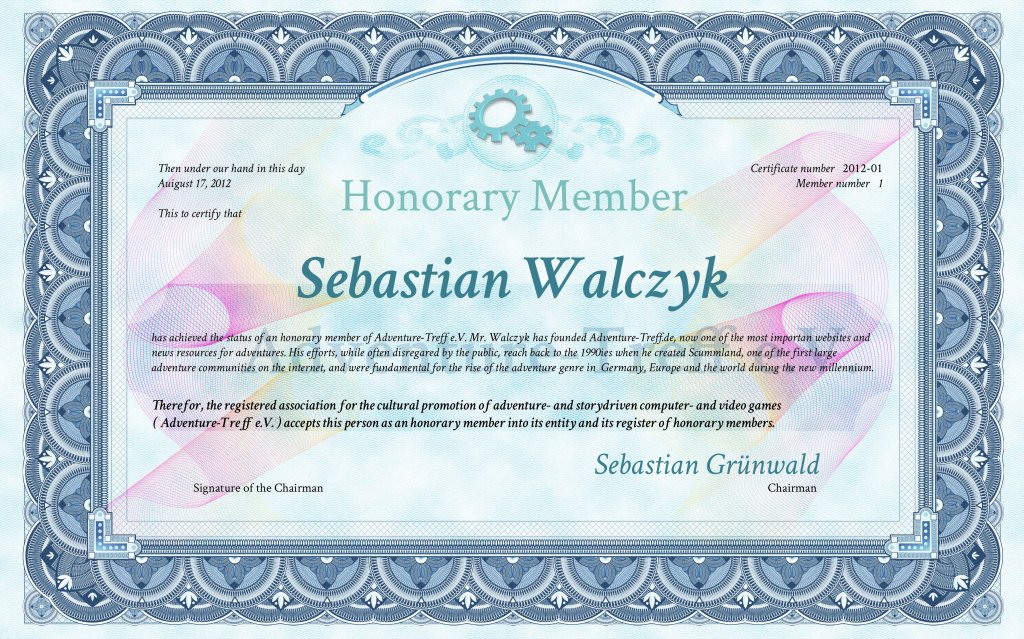 Der'Verein zur kulturellen Förderung von Adventure- und storylastigen Computer- und Videospielen e.V.'wählt jedes Jahr das Ehrenmitglied des Jahres. Ehrenmitglied kann nur werden, wer sich um das Adventure-Genre besonders verdient gemacht hat - sei es durch tolle Spiele, herausragende Pressearbeit oder tolle Fan-Projekte - was das Genre besonders gestärkt hat, ist berechtigt zur Nominierung. Der Gewinner erhält einetolle Urkundeund einen Ehrenplatz im Herzen der Adventure-Community und der Vereins-Mitgliederliste!