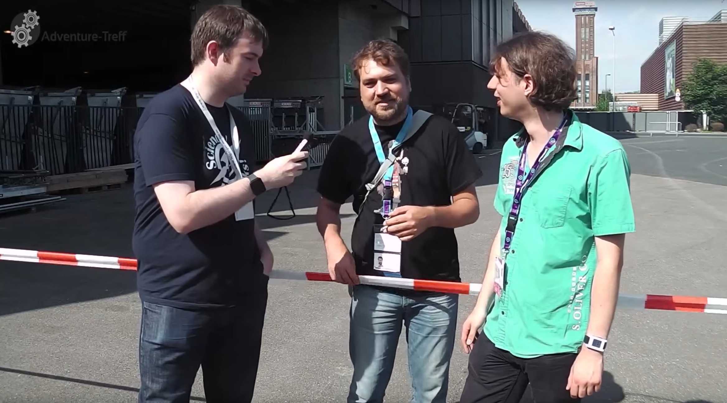 Doch 2015 war ein sehr gutes Jahr für offene Adventure-Spieler. Das Genre schien gerettet, die Zahl der Neuveröffentlichungen und Ankündigungen endlos. Das zeigte auch die gamescom, auf der wir, aus einer spontanen Schnapsidee heraus, das wohl unvorbereitetste und lustigste Interview führten, dass wir je gefilmt haben. Durch das Durchforsten von Spielelisten hatte Basti kurz vor der gamescom herausgefunden, dass Daedalics höchst geheimes, neuestes Projekt ziemlich sicher State of Mind heißen würde und von Martin Ganteföhr geschrieben wurde. Hieraus entstand der Plan, den ohnehin etwas planlosen Jan „Poki“ Müller-Michaelis mit einer ungewöhnlichen Interviewtechnik so zu verwirren, dass er aus Versehen Details ausplauderte, die er nicht hätte erwähnen dürfen. Die Idee war einfach: Jan und ich stellten je eine Frage und Poki durfte sich eine davon aussuchen. Nachdem wir diesen Modus erklärt hatten, bluffte Jan bei der ersten Frage, in dem er einfach den von uns herausgefundenen Titel nannte. Poki ging dadurch davon aus, dass es sich um eine freigegebene Information handelte und erzählte uns alles zum Titel. Im Schnitt nahmen wir die Tonspur heraus und packten einen Zensurgnom aus Harveys neue Augen über Pokis Mund, denn die Informationen durften ja noch nicht veröffentlicht werden. Es folgten chaotische Fragen mit unglaublich lustigen Antworten. Im Schnitt war dann schnell die Idee geboren, diese knapp acht Minuten an Merkwürdigkeit als „Fast ein Interview" zu bezeichnen. Dass hieraus eine Serie entstehen würde, die immer verrücktere Formen annehmen würde, war uns zu diesem Zeitpunkt noch nicht klar.