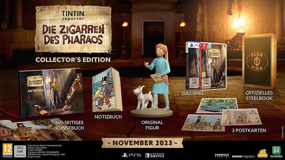 Die gewaltige Box beinhaltet ein 160-seitiges Artbook, einen Notizblock, eine Figur, ein Steelbook, drei Postkarten und natürlich das Spiel. Im Handel kostet sie regulär 189 €! Zusätzlich legt astragon euch auch noch den dazugehörigen Comic aus dem Carlsen-Comics-Verlag bei, der euch auf 64 colorierten Seiten die Original-Geschichte der Zigarren des Pharaos aus der Feder von Hergé erzählt.