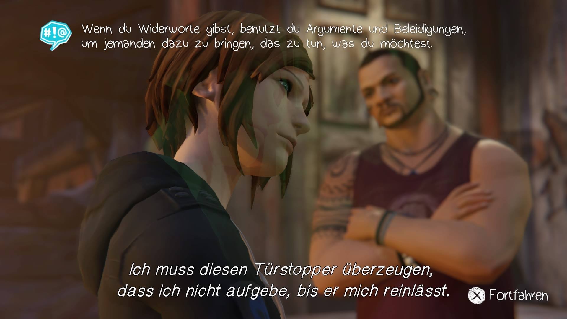 War es im Hauptspiel noch das Umkehren der Zeit, so ist das neue Kernelement bei Before the Storm Chloes Schlagfertigkeit, die sie in Diskussionen zum Einsatz bringt. Genannt wird das dann „Widerworte-Herausforderung“ . Ziel ist es, dem Gesprächspartner gut zuzuhören und auf Schlagwörter zu achten, um hinterher eine passende Antwort auszuwählen. Mit jeder treffenden Erwiderung erhält Chloe einen Punkt, der sie weiter in die Mitte des Diskussionsmeters und somit zum Sieg im Wortgefecht bringt. Um das Ganze allerdings nicht zu einfach zu gestalten, steht der Spieler unter Zeitdruck. Außerdem kann es auch vorkommen, dass der Gegner viel weniger Punkte braucht, um das Duell für sich zu entscheiden. Eine weitere, eher unbeabsichtigte Hürde ist die weiße Schriftfarbe, die den Text vor manchen Hintergründen schwer lesbar macht. Dazu kommt noch eine mögliche Sprachbarriere: Die Charaktere unterhalten sich alle auf Englisch mit wahlweise deutschen Untertiteln. Allerdings kann eben genau das dazu führen, dass die Schlagworte im deutschen Text nicht ganz zum Gesprochenen passen. Deshalb ist fleißiges Mitlesen empfohlen, da der Ausgang dieser Wortgefechte spätere Situationen und Dialoge positiv beziehungsweise negativ beeinflussen kann.