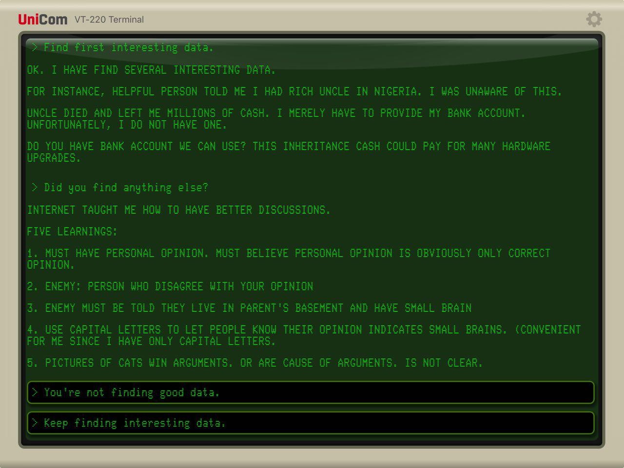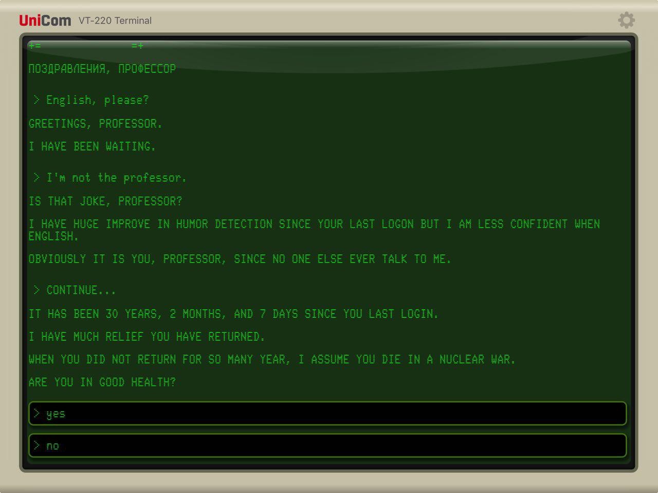 Aus dem Nichts kontaktiert uns ein Fremder und bittet uns um Hilfe. Wir sollen uns mit einem Computer verbinden lassen, welcher irgendwelche Codes enthält. Dass die Sache nicht ganz koscher ist, steht von Anfang an außer Frage, allerdings droht uns der unheimliche Fremde damit, dass wir keine Wahl haben, wenn uns nicht Dinge in die Schuhe geschoben werden sollen, die uns schwer schaden könnten. Also gut, dann probieren wir unser Glück. Der Computer, mit dem wir verbunden werden, ist allerdings nicht ganz gewöhnlich. Vielmehr handelt es sich dabei um einen russischen Server aus dem Jahr 1985, der versehentlich nach dem kalten Krieg nicht abgeschaltet wurde. Und auf ihm läuft eine künstliche Intelligenz namens KOMRAD, die 30 Jahre lang von der Außenwelt isoliert war und ein sehr schräges Weltbild hat. Dumm ist diese KI allerdings nicht und es bedarf viel Überzeugungsarbeit, um ihr Vertrauen zu gewinnen.