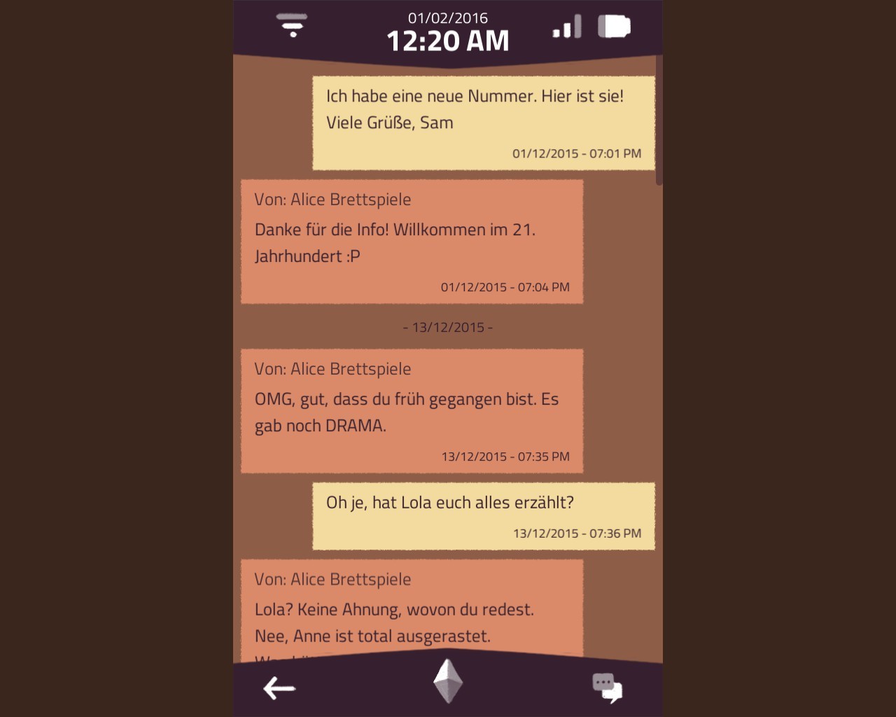 Die Ausgangslage ist ebenso simpel wie faszinierend: So stößt der Spieler bei einem abendlichen Spaziergang auf ein herrenloses Mobiltelefon, dessen Speicherzelle noch nicht erschöpft ist. Und da eine gesunde Neugierde in der Natur des Menschen begründet liegt, kann sich dieser dem Reiz der darin verborgenen Informationen nicht widersetzen. Rasch stellt sich heraus, dass es sich bei dem Besitzer des gefundenen Smartphones um einen achtzehnjährigen Jungen namens Sam handelt. Diese Erkenntnis bildet aber lediglich den Einstieg in eine tiefgreifende Geschichte, die sich anhand von Chatnachrichten, E-Mails und Internetverläufen allmählich aufschlüsseln lässt. Bald erfährt man, dass Sam von liebenden Eltern umsorgt wird und darüber hinaus scheinbar ganz gewöhnliche Kontakte zu Mitschülern und Freunden sowie Bekannten aus verschiedenen Interessenskreisen pflegt. Auf den ersten Blick entsteht der Eindruck einer halbwegs glücklichen Jugend, die jener Protagonist in der heimeligen Vorstadt Melren genießt. Zwischen den Zeilen kommt jedoch eine andere, ungewisse Seite von Sam zum Vorschein. Einige seiner Handlungen vermag der Spieler nicht zu begreifen: Warum etwa trennt sich Sam derart unvermittelt von seiner bezaubernden Partnerin Melissa? Und womit lässt sich diese kryptische Drohung einer Mitstreiterin aus dem Brettspiele-Treff erklären? Über all dem steht allerdings eine besonders wesentliche Frage im Raum: Wer IST eigentlich dieser Junge mit den zahlreichen Geheimnissen – oder wer glaubt er zu sein?