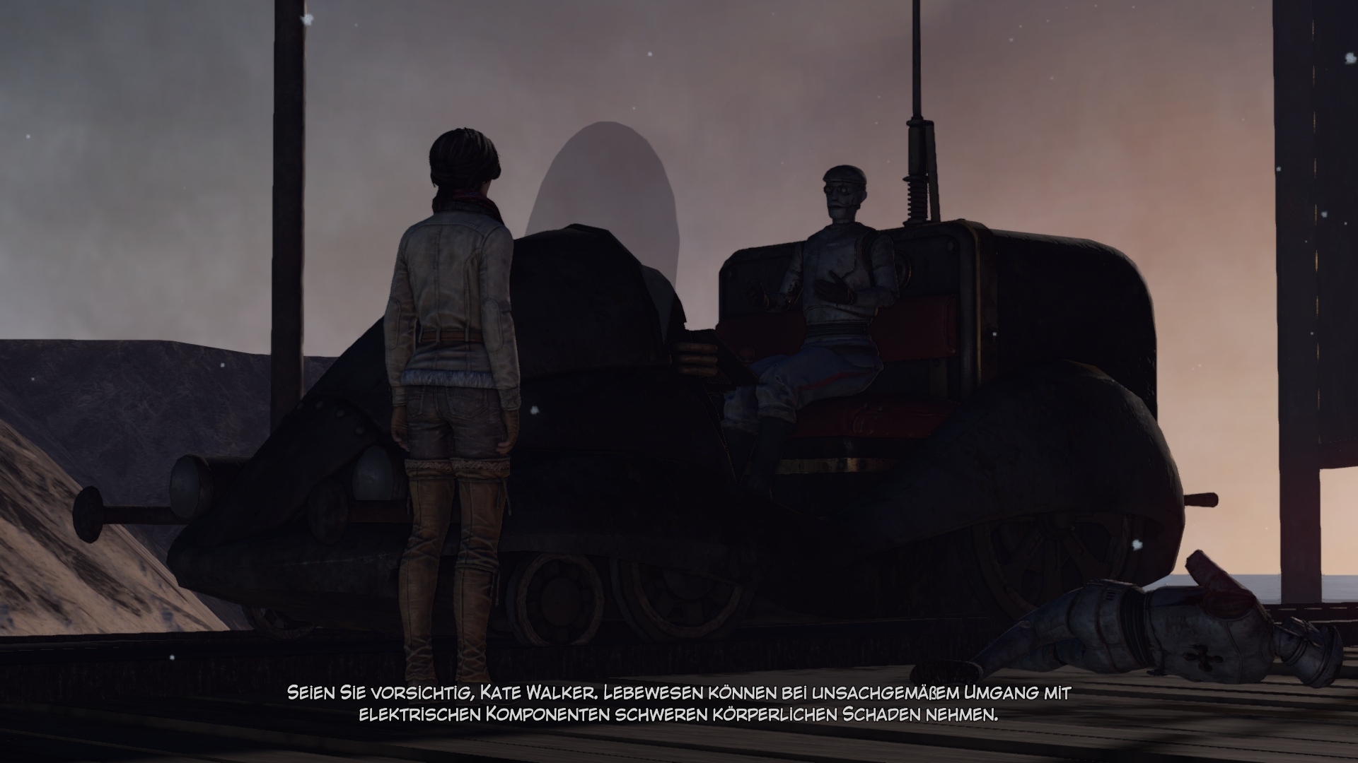 Das Syberia-Gefühl stellte sich sofort ein, als die beeindruckenden Bilder, untermalt von toller Musik, mich in ihren Bann zogen – einfach schön. Leider begann dann irgendwann der Teil, wo ich die Steuerung übernehmen sollte und damit fingen die Probleme an. Auch nach Stunden eierte Kate bei mir über den Bildschirm und kollidierte gefühlt mit allem, was zu sehen war. Darüber hinaus ließen sich einige Aufgaben nur durch Arbeiten mit Maus und teilweise zusätzlich den Tasten lösen, das empfand ich ebenfalls als anstrengend. Auch die Suche nach den Hotspots und Interaktionsmöglichkeiten war mühselig. Hinzu kam die Kameraführung, bei der sich meine Motion Sickness dann auch noch zu Wort meldete. So konnte ich die schöne Atmosphäre, die gelungenen Charaktere und die gut umgesetzte englische Sprachausgabe leider immer weniger genießen und habe dann erstmal abgebrochen, da der Spielspaß einfach zu kurz kam.
