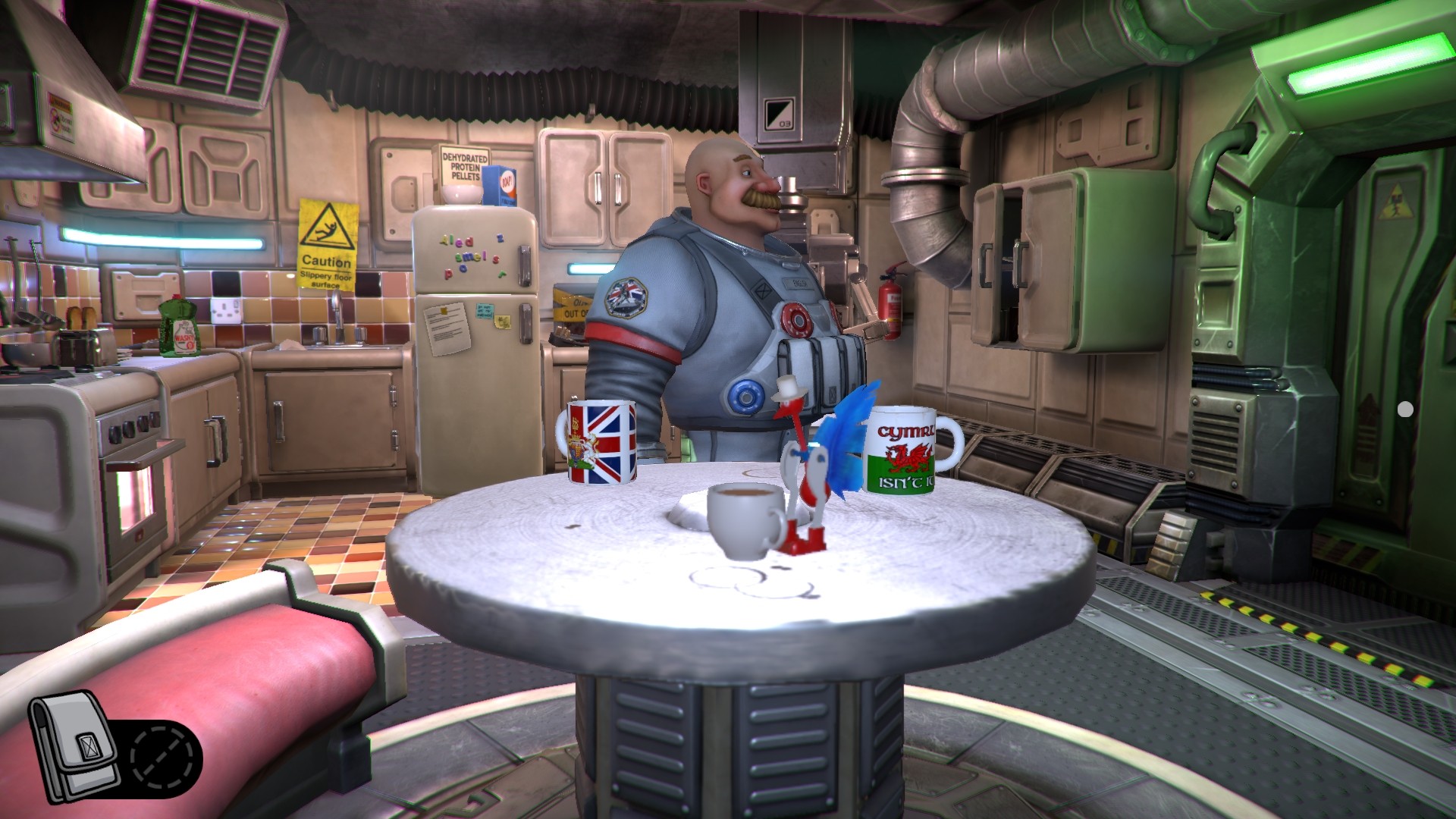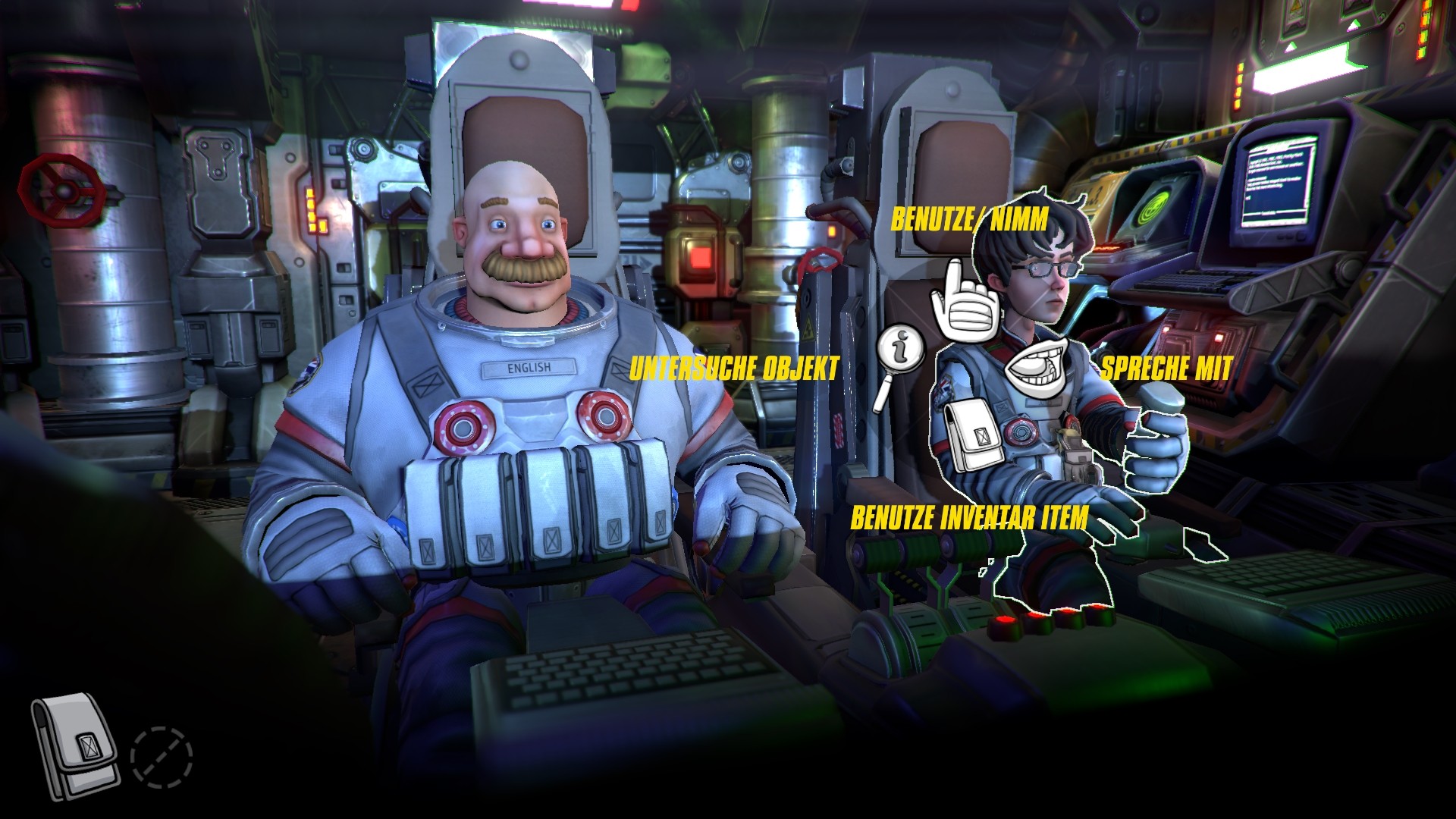 Das Spiel ist komplett in einem 3D-Comiclook gehalten. Dieser ist sehr hübsch anzusehen. Auch wenn das Raumschiff durch Grautöne beherrscht wird, haben die Entwickler eine Umgebung geschaffen, in der sich gerne umgeschaut wird. Überall gibt es nichtspielrelevante Kleinigkeiten zu entdecken. Hinter einer Tür befindet sich zum Beispiel ein Staubsauger, der uns beim Öffnen dieser direkt angreift. Kapitän English muss nun schauen, dass er den Staubsauger wieder sicher hinter der Tür verstaut. Dies passiert automatisch und ist hübsch animiert. An anderer Stelle können wir ein Laufband benutzen. Hier müssen wir selbst Hand anlegen und den Kapitän mit der Kreuz- und Viereckstaste zum Laufen bringen. Er hört lediglich automatisch damit auf, wenn er aus der Puste ist. Leider befinden wir uns die meiste Zeit des Spiels auf dem Raumschiff und dieses ist nicht besonders groß. Einige weitere besuchbare Locations im Weltraum wären schön gewesen. Auch der Blick in den Weltraum bleibt uns die meiste Zeit verwehrt. Die Kameraperspektive ist fest und kann nicht manuell verstellt werden. Sie bewegt sich allerdings passend mit, so dass nur selten die Gefahr besteht, einen relevanten Gegenstand in der Umgebung zu verpassen. Zumal die Hotspots auffällig umrahmt werden, wenn English in deren Nähe kommt.