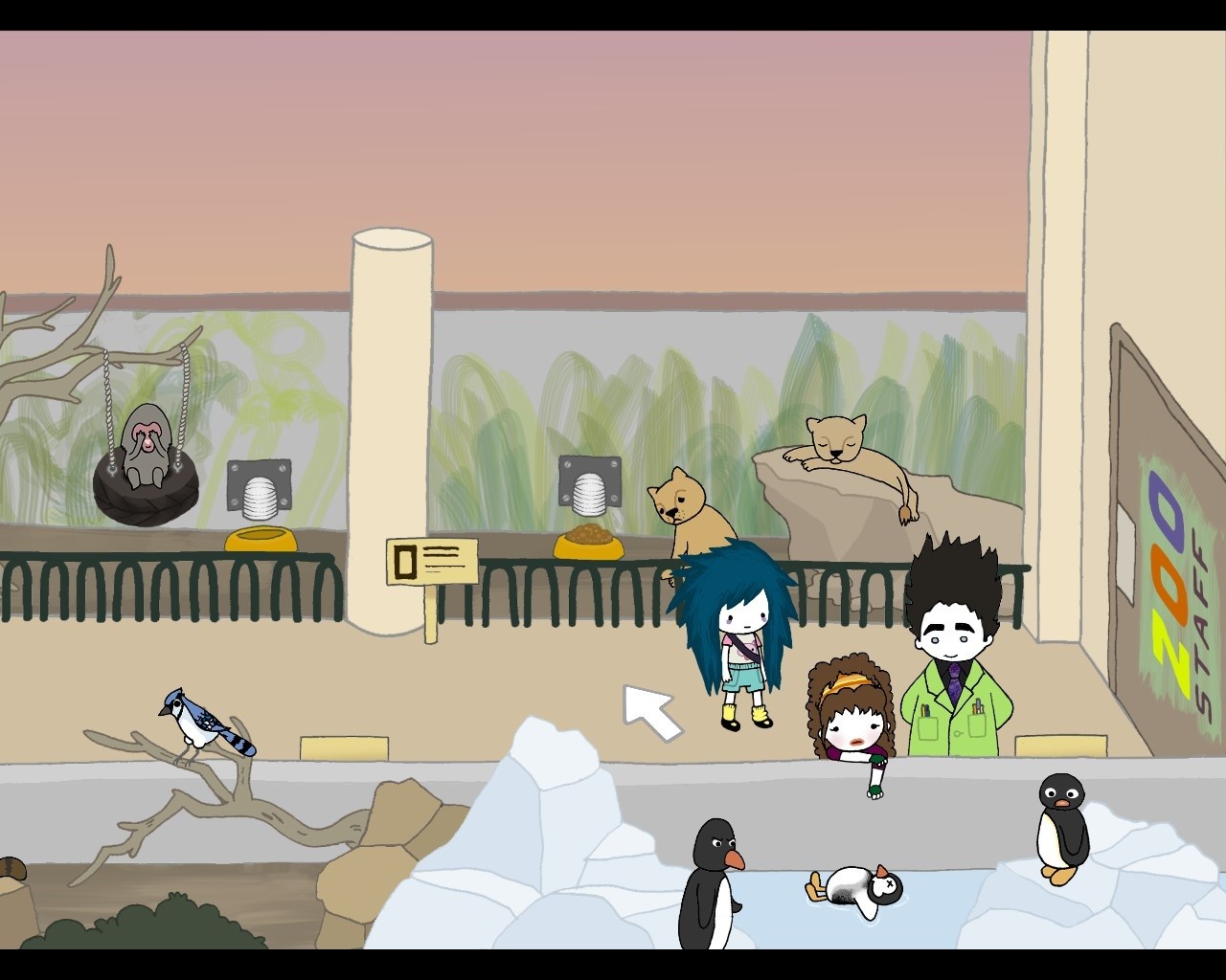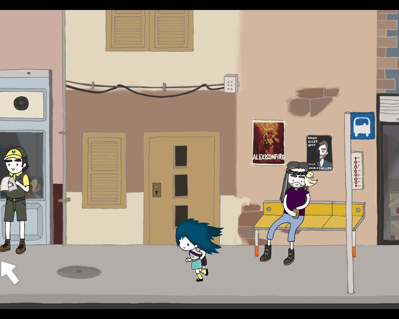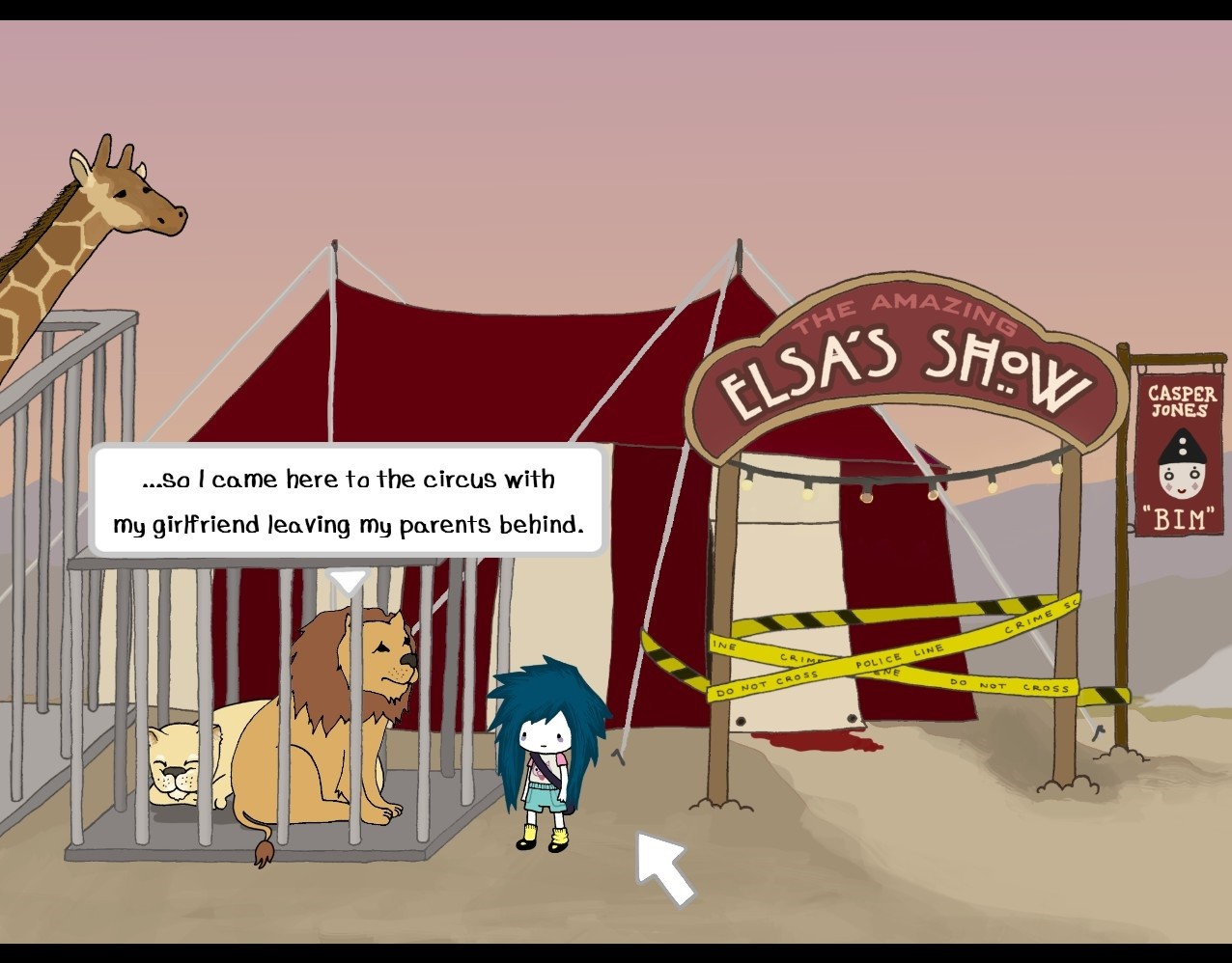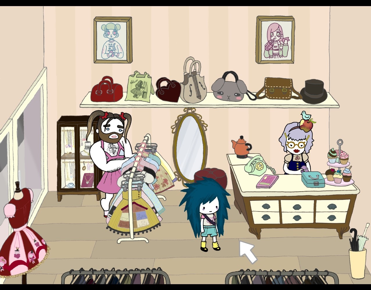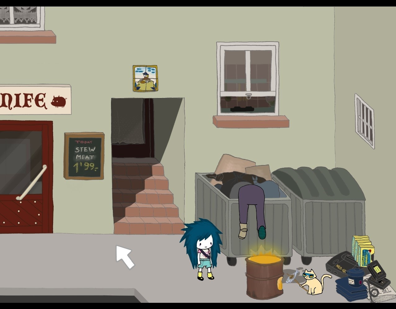 Da schon Nika Allens Abenteuer in derselben Nachbarschaft angesiedelt war, konnten viele Schauplätze sowie einige vertraute Gesichter aus der Vorgänger-Episode problemlos wiederverwertet werden. Darüber hinaus wurden bislang ungesehene Locations integriert, wie etwa die zuvor erwähnte Bibliothek, der Zoo, die Farm oder das Burger-Restaurant. Besagte Szenenbilder scrollen häufig seitlich in die Länge, da die Produzenten wohl ein Faible für große Areale hegen. Diese wurden aber entsprechend mit Details ausgeschmückt und laden somit stets zum Erkunden ein. Aus dem liebevollen, handgezeichneten Grafikstil der Psychotic Adventures erwächst ein tolles Alleinstellungsmerkmal. So mutet das Spiel wie ein interaktives Bilderbuch an, das durch putzige Schweinchen, Küken, Löwen oder Menschenkinder angereichert wurde. Daher wurde auch unsere Heldin ebenso niedlich wie charakteristisch gezeichnet. Ihre Markenzeichen sind das struppige blaue Haar, die Tränensäcke unter den Augen sowie ihre eigenwilligen, kaum mädchenhaften Klamotten. Diese unschuldigen Impressionen verlieren sich allerdings rasch, sobald Agatha das erste Schwein schlachtet und der Blick des Spielers schonungslos auf dessen Eingeweide und die blutgetränkten Bodenfliesen gelenkt wird. Mit solch brutalen und unappetitlichen Begebenheiten wird man überwiegend in den Zwischensequenzen konfrontiert, die als Aneinanderreihung von mit Text unterlegten Standbildern präsentiert werden. Dabei wird das Bilderbuchgefühl sogar verstärkt und dank besagter Grausamkeiten zugleich entkräftet. Hiervon abgesehen verhält sich das Spiel niemals statisch. Regungen lassen sich hinter jeder Straßenecke vernehmen und lobenswert flüssige, überaus authentische Charakteranimationen runden das grafische Gesamterlebnis ab.