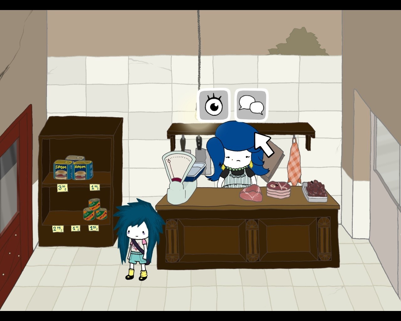 Um dieser ungewöhnlichen Religion Akzeptanz zu verschaffen, bedarf es einiger Vorbereitung und eingängiger Konversation. Als Ansprechpartner in Glaubensangelegenheiten stellt sich Awesome Sandro zur Verfügung, ein leidenschaftlicher Magier mit Sucht nach Anerkennung. Er zeigt Agatha die einzelnen Schritte auf, welche zur Gründung des Karnivorismus erforderlich sind, und lenkt das Spiel zugleich in eine äußerst lineare Richtung. Fortan diktiert der begabte Schönling mit der langen Mähne also unserer Metzgertocher das weitere Vorgehen. Demnach muss etwa ein Buch mit leeren Seiten aufgestöbert werden, das als Bibel des Karnivorismus Verwendung finden soll. Damit Agatha künftig Predigten im Schlachtraum abhalten kann, muss darüber hinaus der Name des Fleischwarenladens auf den ihren umgeschrieben werden. Im Zuge dieser Mission ist bei Muttern Überzeugungsarbeit zu leisten und die Ursache der finanziellen Krise im Familienbetrieb zu eruieren. Eine Straßenumfrage liefert Agatha rasch Antworten und zwingt sie zum Handeln. Obgleich Inventarrätsel und sonstige Knobeleien niemals auf der Strecke bleiben, wird doch ein Großteil des Spielverlaufs durch Dialoge bestimmt. Eine gewisse Textlastigkeit, die auch mal anstrengen kann, ist nicht zu leugnen. Eben jene Zeilen aber bringen Agathas kindliche Naivität und die Verdrehtheit der Situationen ideal zum Vorschein. So schließt der Spieler das merkwürdige Mädchen bald ans Herz und erfreut sich zudem am Gespräch mit all den skurrilen Charakteren, denen er in dieser Stadt begegnen wird. Selbstverständlich ist auch Freundin Nika Allen mit von der Partie und für manchen kleinen Gefallen dienlich. Vor allem gilt: Wer schwarzen Humor mag, wird Agatha Knife lieben - und sich selten langweilen. Das Rätseldesign dürfte in dieser Hinsicht womöglich weniger Auftrieb geben – dieses zeugt zwar von Witz und Kreativität, fügt sich somit perfekt in das Geschehen ein, bleibt allerdings eher an Genre-Neulinge gerichtet. Die Aufgaben arten häufig in Botengänge aus, die im Grunde super ins Konzept passen. So muss selbstredend mitgedacht werden, die Lösung ist jedoch meist schnell erkannt.