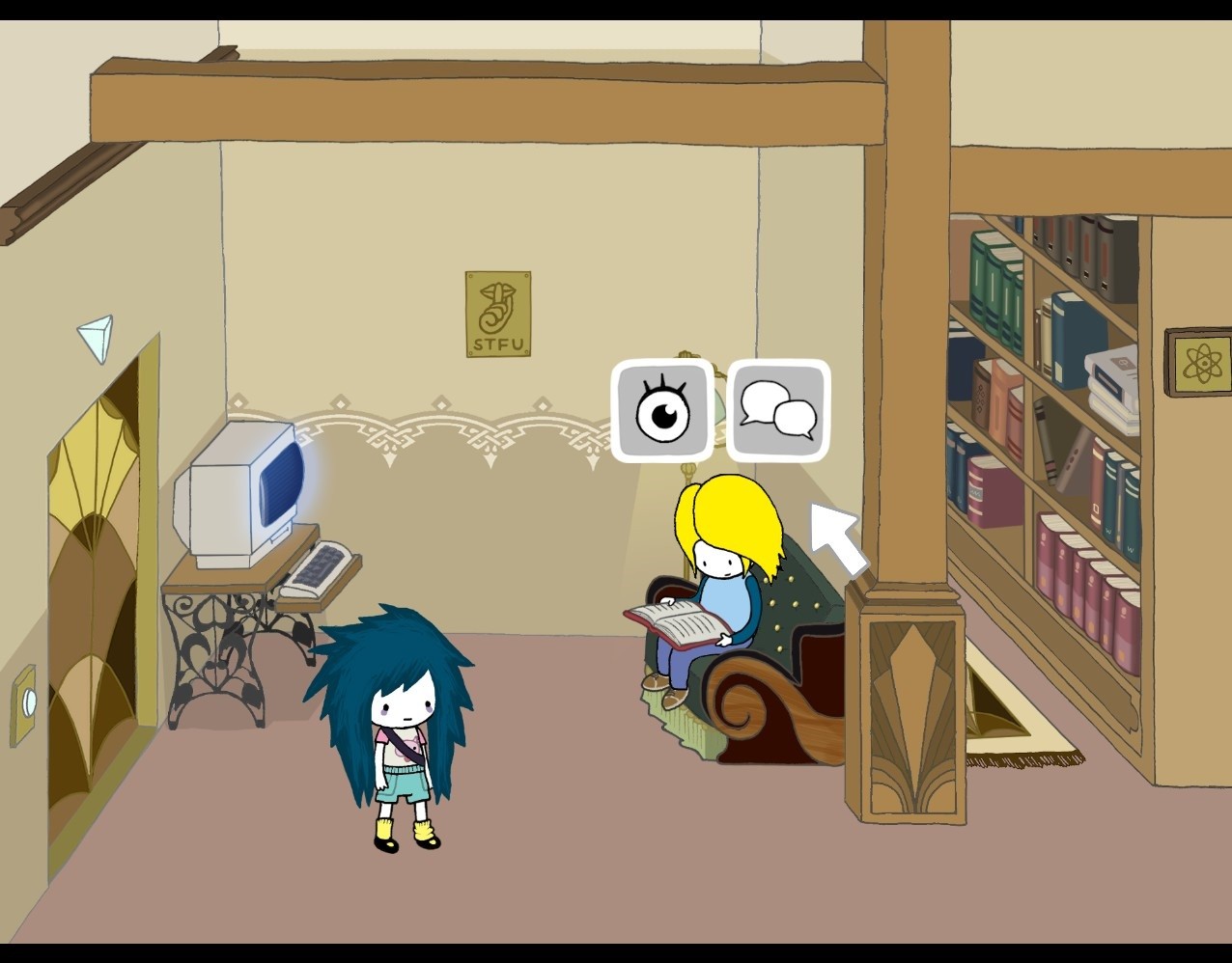 An der Steuerung lässt sich nicht viel bemängeln. Bloß die in Gedankenblasen aufgeführten Dialog-Optionen können mitunter verwirren: So muss man horizontal durch die anzuwählenden Mulitple Choice-Gedanken scrollen, die niemals gemeinsam gelistet werden. Die technische Umsetzung ist dennoch gelungen und auch optisch schön anzusehen - ebenso wie das Innere von Agathas Umhängetasche, die sich mit Klick auf unsere Protagonistin öffnen lässt. Diese umfasst zahlreiche Item-Slots, die Agathas Fundstücken Platz bieten. Ein USB-Stick in Gestalt eines Schweinchens sichert dort zudem den Spielstand. Bedauern darf man natürlich, dass nur ein einziger Speicherstand vorhanden ist. So muss zunächst "resettet" werden, bevor ein neuer Spieldurchlauf begonnen werden kann. Wenngleich kaum mehr als fünfundzwanzig Szenenbilder existieren, sind sie meist Teil einer frei begehbaren Umgebung. Der Spieler steuert Agatha also stets durch dieselben Straßen einer behaglichen Kleinstadt und kann sie mit einem Doppelklick sogar zum Rennen bewegen. Hierbei können diverse Häuser, Geschäfte oder eine Bibliothek betreten werden, manche Orte sind hingegen erst im späteren Verlauf zugänglich.
