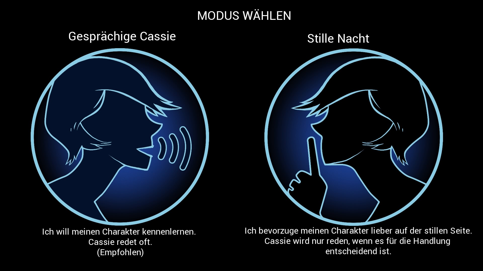 Zu Beginn des Spiels kann zwischen zwei Modi gewählt werden. Nimmt der Spieler die gesprächige Cassie, erzählt sie häufiger etwas und wird so besser kennengelernt. Bei der zweiten Variante spricht Cassie nur, wenn es für die Handlung entscheidend ist. Hier werden also einige Informationen verpasst, so dass das Spiel selbst die erste Möglichkeit empfiehlt. Eine Änderung der Einstellung kann im Menü jederzeit vorgenommen werden.