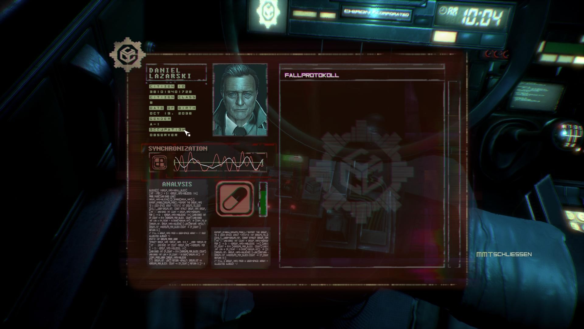 2084 ist die Technik weit fortgeschritten. Gleichzeitig liegt die Menschheit am Boden. Eine digitale Seuche und ein großer Krieg haben unzählige Opfer gefordert. Wer überlebt hat und nicht zu einer privilegierten Klasse gehört, lebt in einer trostlosen, fast vollständig digitalen Welt, die gnadenlos durch ein übermächtiges Unternehmen beherrscht wird. Die Wenigsten kommen ohne digitale und mechanische Ersatzteile für ihren Körper und Geist aus. Das macht sie leicht angreifbar: Wer ein Hirnimplantat besitzt, kann manipuliert und vor allem ausgelesen werden. Dafür sind die >observer_ zuständig. Bei Kriminalermittlungen verbinden sie sich mit Opfern und Tätern, um in deren Bewusstsein nach Antworten zu suchen. Einer von ihnen ist Daniel Lazarski. Nach einem Anruf seines verloren geglaubten Sohnes verirrt er sich in den unzähligen Gängen und Zimmern eines Wohnblocks, während er einen brutalen Killer jagt.