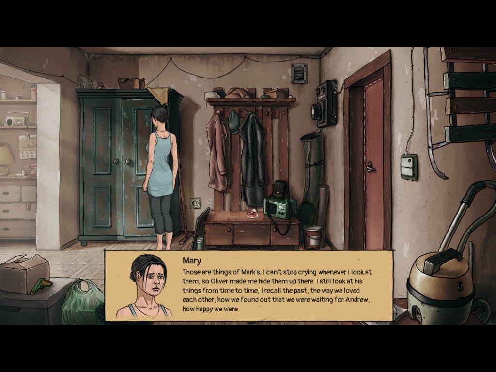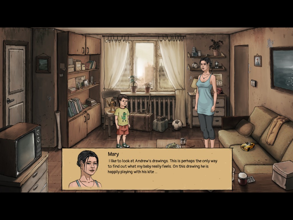 Erzählt wird das interaktive Drama aus der Perspektive von Mutter und Sohn, wobei letzterer einen eher kürzeren Zwischenpart bestreiten muss. Während Mary uns unverhüllte Einblicke in ihre persönliche Realität gewährt, entführt uns Andrew in seine kindlichen, wenngleich ähnlich düsteren Fantasiewelten. Dort flüchtet er in ergraute Erinnerungen vergangener Tage, sehnt sich nach der ehrlichen Liebe seines leiblichen, unlängst verstorbenen Vaters und findet diesen sogar in einer Gefängniszelle vor. Im Rahmen dieser traumartigen Szenen kommt auch Olivers unerfreuliche Jugend zur Sprache. Dieser Aspekt wird aber nur oberflächlich thematisiert, sodass jener handgreifliche Alkoholiker im Auge des Betrachters bloß ein widerwärtiger Dreckskerl bleiben wird. Nichtsdestotrotz erfüllen die Protagonisten ihren Zweck: Besonders Mary und Andrew wurden zu authentischen Charakteren ausgearbeitet, deren Schicksal den Spieler betroffen macht.
