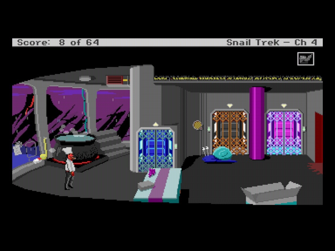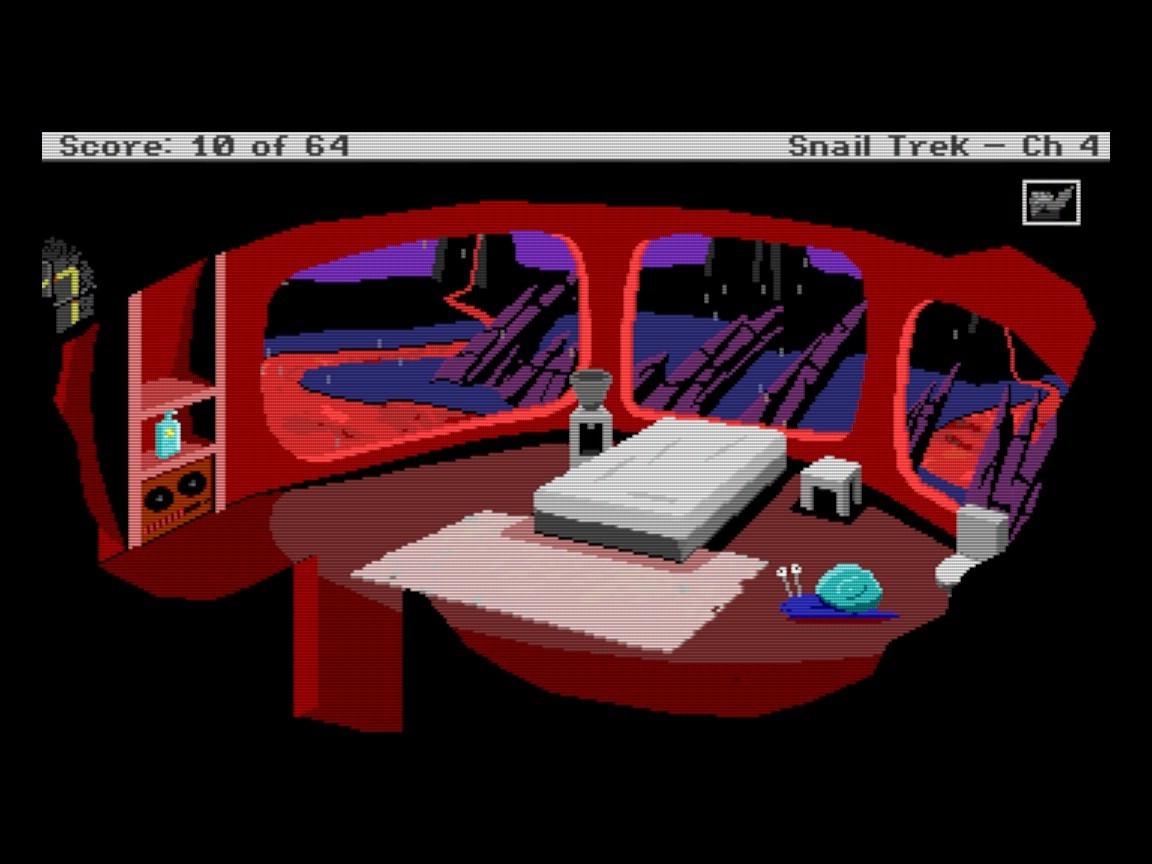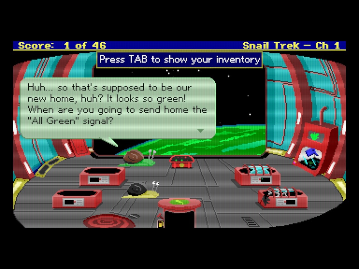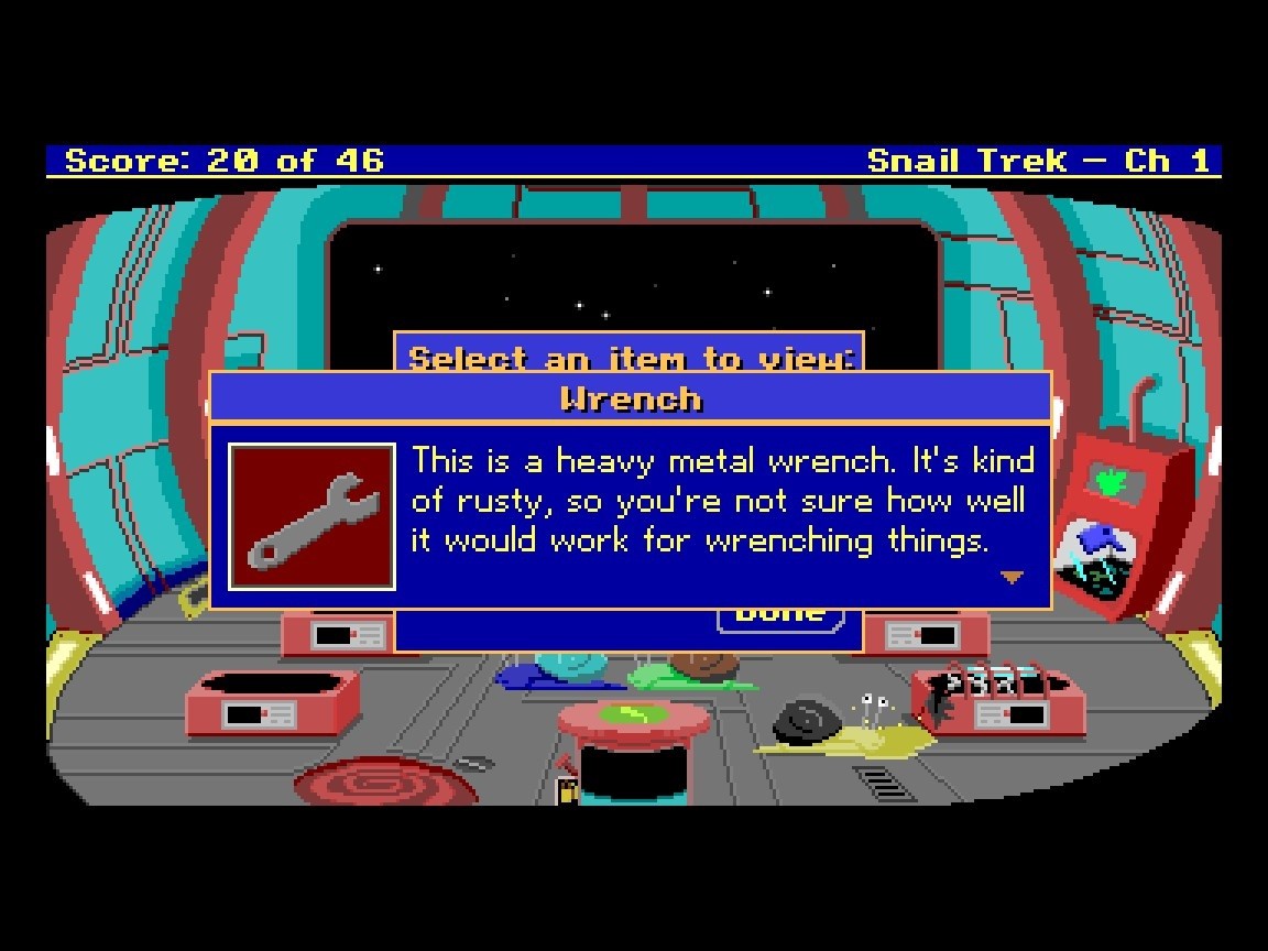 Mehr als zwanzig Jahre sind verstrichen, seit wir Roger Wilco, den wohl beliebtesten Hausmeister der Adventure-Historie, auf seinem letzten haarsträubenden Weltraumabenteuer begleiten durften. Was sich damals schon in hochauflösendem Super-VGA erleben ließ, begann in den 80ern dereinst mit Texteingabe und einer EGA-Grafik, welche heute bestenfalls von hoffnungslosen Nostalgikern als ästhetisch empfunden wird. Womöglich ist es aber gerade die wertvolle Erinnerung an jene verlorene Zeit, die aufstrebende Spieleentwickler wie Phil Fortier dazu antreibt, sich auf Genre-Parodien im besagten Gewand zu spezialisieren. Als Hommage an die soeben umschriebene Sierra-Reihe Space Quest rief dieser nämlich vier minimalistische Independent-Adventures ins Leben, in denen sich halbverhungerte Schnecken nach Vorbild einer Enterprise-Crew auf einer hochtechnisierten Kommandobrücke tummeln und sich anschließend auf eine bedeutsame Forschungsmission begeben. Snail Trek erschien ab November 2017 quasi in monatlichen Salathäppchen – kein Schneckentempo also, sondern zumindest gemäßigte Lichtgeschwindigkeit.
