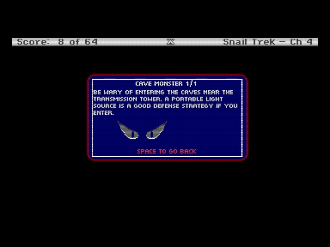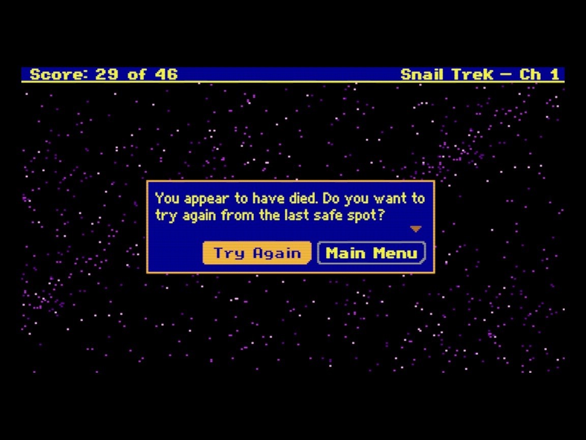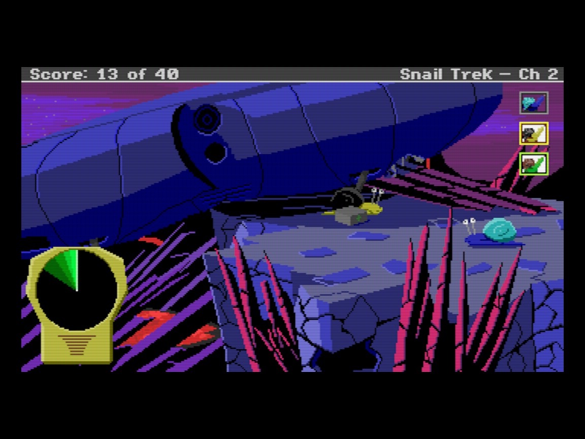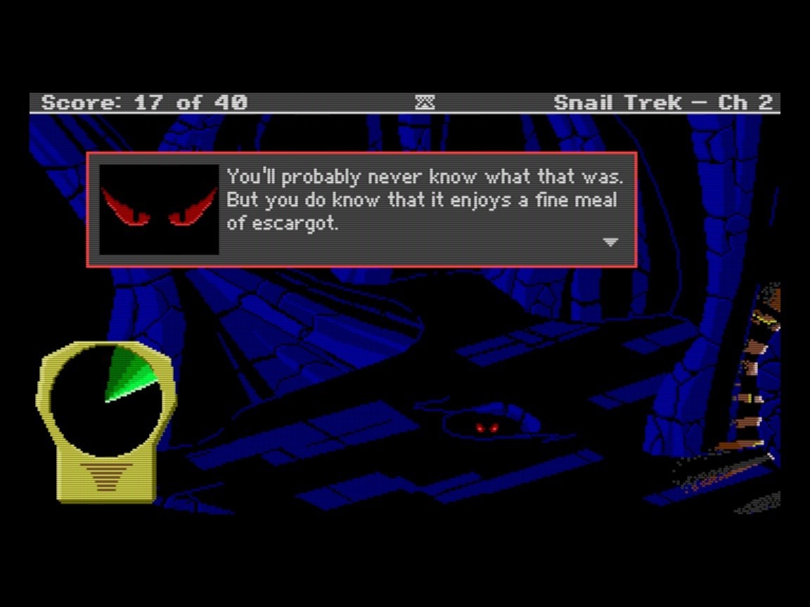 Dem Autor dieses herrlich absurden Adventures mangelte es niemals an witzigen Ideen. Ein hochentwickelter Detektor dient der Suche nach kostbarem Blattgemüsevorkommen und ein Notvorrat an chemischem Salatkonzentrat lässt unsere Kosmonauten wortwörtlich in neuem Glanz erstrahlen (und somit im Dunkeln leuchten). Dennoch würde Snail Trek der unvergessenen Sierra-Ära nicht ausreichend Tribut zollen, wären da nicht auch ein wenig Tod und Verderben ins Gameplay eingebettet. Wenn unsere Schnecken keinen unverhofften Unfall erleiden, lauern ihnen dort draußen dann und wann Monster auf, die einem herzhaften Frühstück nach französischer Küche nicht abgeneigt sind. Der gute Douglas Adams hätte die aufkeimende Besorgnis des Spielers nun mit einem „Don‘t Panic!“ geschlichtet, was bei einem derart modernen Retro-Titel definitiv angebracht scheint. Eine post mortem anwählbare Try-Again-Schaltfläche lässt das geschehene Unglück nämlich schlagartig wieder umkehren. Ebenso wurden die damals üblichen Sackgassen (Dead Ends) vermieden.