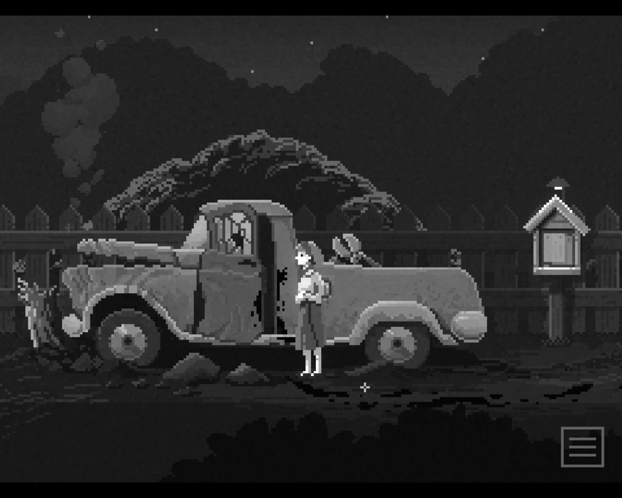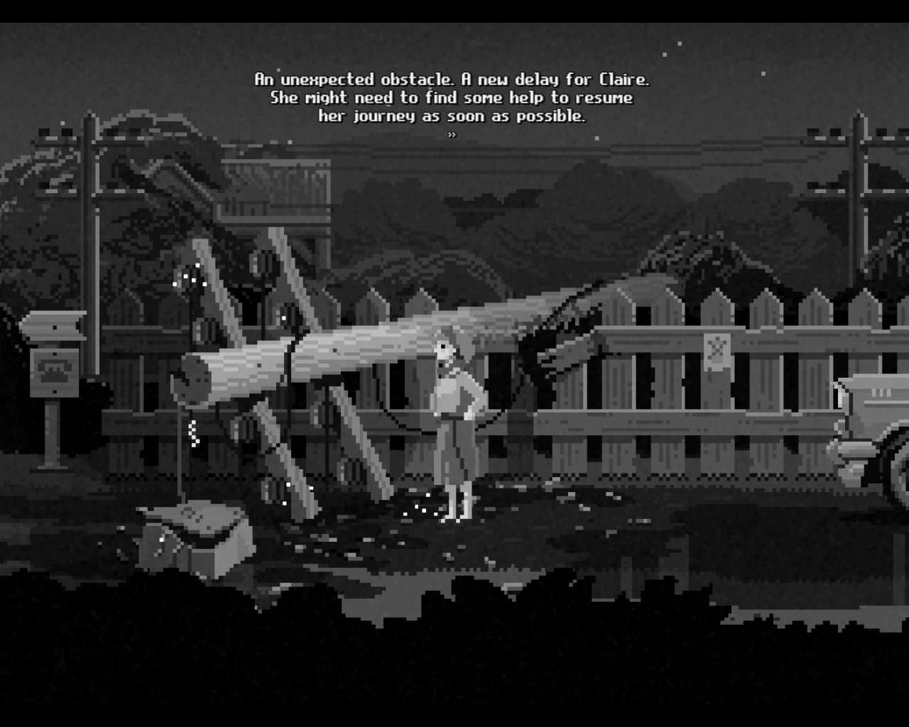 Gewiss spielt Navarro auch in der Rolle des Entwicklers in erster Linie seine Stärken aus. Die allzu hinreißend gezeichneten Schauplätze lassen keine Details vermissen und beweisen eindrucksvoll, wie viel Stimmung gute Pixelkunst erzeugen kann. Authentische Effekte und Animationen hauchen der nächtlichen Einöde Leben ein. Sei es die rauchende Motorhaube eines verunglückten Trucks oder Regenpfützen, in denen sich die Zaunlatten oder Claires Beine spiegeln.