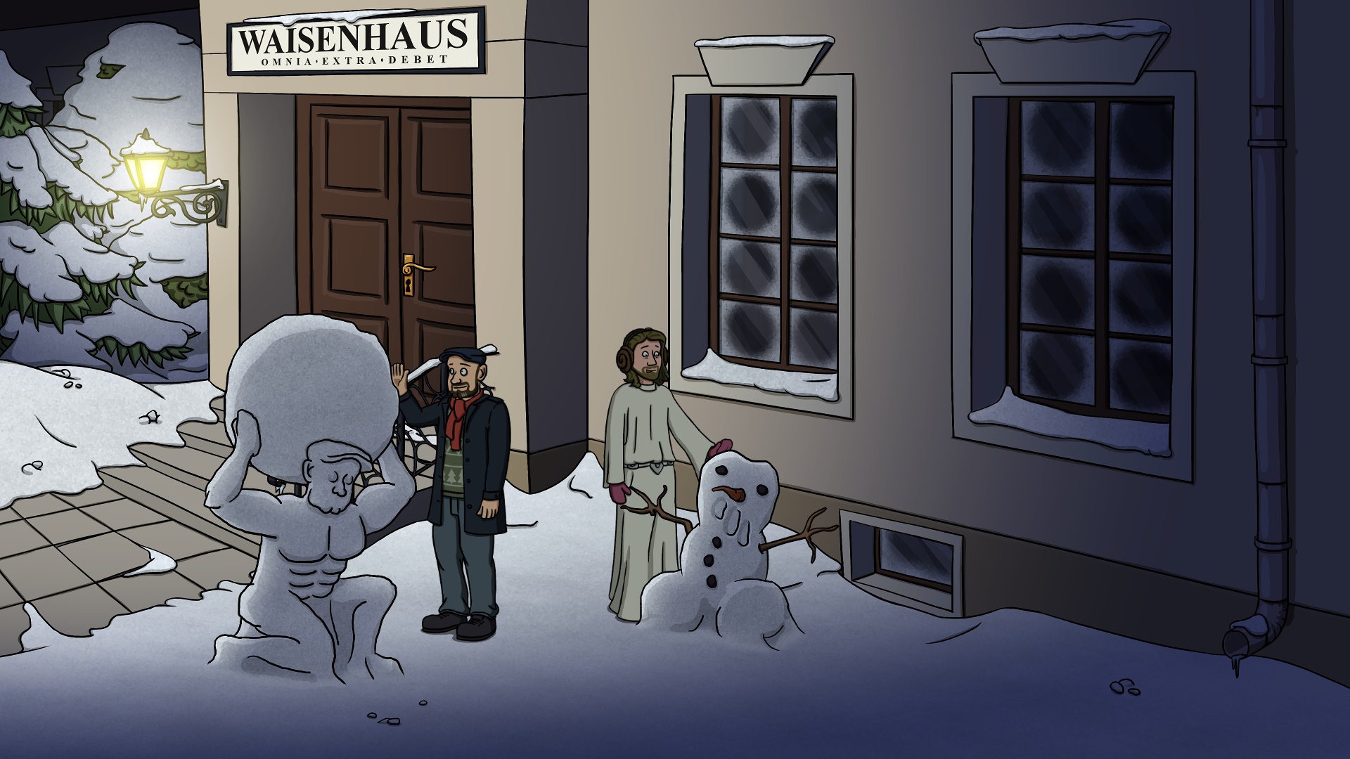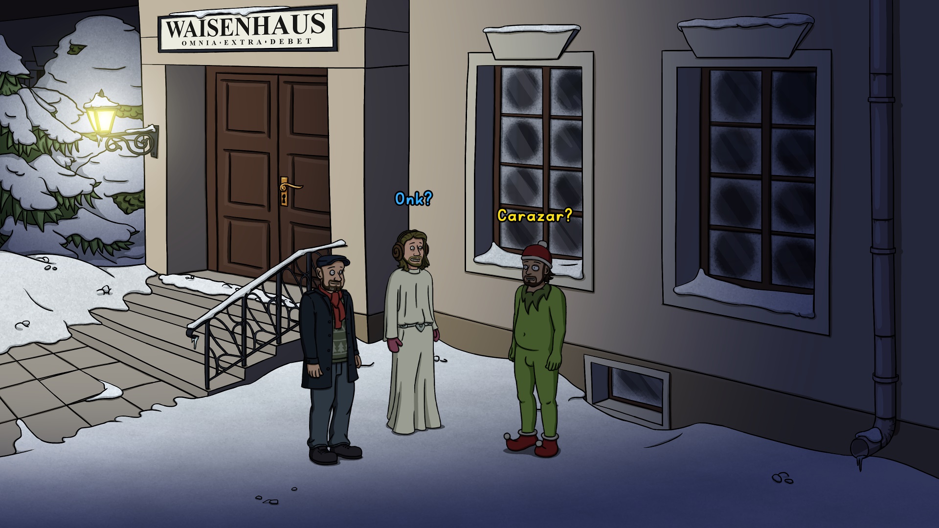 Bisher gibt es OnXsventure nur in einer deutschen Fassung. Diese besteht lediglich aus Untertiteln, eine Sprachausgabe ist dagegen nicht vorhanden. Da sich die Texte insgesamt in Grenzen halten und es kaum Gespräche gibt, ist das nicht weiter schlimm. Wobei eine Sprachausgabe mit den entsprechenden Let's Playern natürlich gut gepasst hätte. Auch mit Musik ist Pan Sartre diesmal sparsamer umgegangen. Wenn sie zum Einsatz kommt, unterstreicht sie das weihnachtliche Thema. Auch Soundeffekte werden an den richtigen Stellen verwendet.