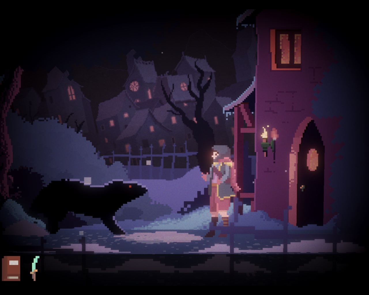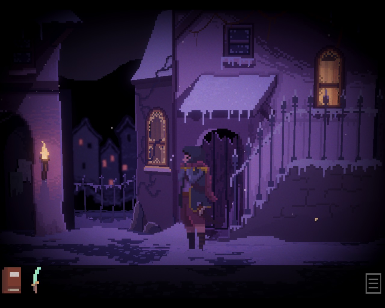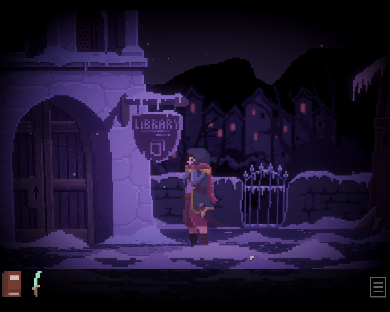 Die scheinbar mittelalterliche Umgebung präsentiert sich in einem detailverliebten Pixelstil, der von herausragender Kunstfertigkeit und einer ungewöhnlichen Farbgebung zeugt. Während beharrlich glimmende Fackeln die Nacht erhellen, ist die Architektur des altertümlichen Städtchens dominiert von blauen, pinken oder purpurnen Nuancen. Derweil tobt ein unbeugsamer Schneesturm, die weißen Flocken verlieren sich in alle Himmelsrichtungen. Sogar der eisige Atem der Protagonistin ist erkennbar, in beheizten Räumen vernimmt der Spieler ihr pochendes Herz. Das Gewand von Bibliothekarin Liz ähnelt übrigens dem eines Piraten, was der Seelendolch an ihrer Hüfte zudem wunderbar unterstreicht. Mit Stiefeln und blauem Jackett erinnert sie beinahe an einen gewissen Guybrush Threepwood. So erweckt eine nächtliche Bibliotheksinspektion vielmehr den Eindruck einer Abenteuerreise.