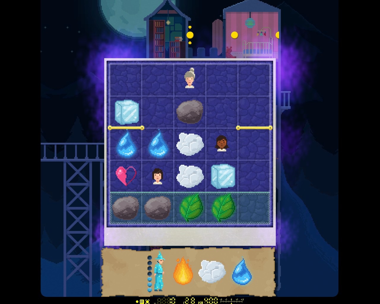 So müssen Cleo und der Alchemist in strategischen Zügen durch einen Hindernisparcours geführt werden, dessen Aufbau an ein Schachbrett erinnert. Wenn beide Figuren das gekennzeichnete Zielfeld erreicht haben, ist die Partie gewonnen. Die Rätselketten im dritten Akt basieren auf den Regeln des chinesischen Tangram-Legespiels, sodass unterschiedlich geformte Holzplättchen korrekt anzuordnen sind. Im gemeinsamen Haushalt zweier Hexendamen hingegen sind Zauberkünste gefragt. Unter Einsatz begrenzt verfügbarer Magieelemente, die an bestimmten Positionen freigesetzt und zur Kombination mit Wassertropfen, Wolken, Eiswürfeln oder Blättern angewandt werden können, sind gefährdete Menschen aus ihrer misslichen Lage zu befreien.