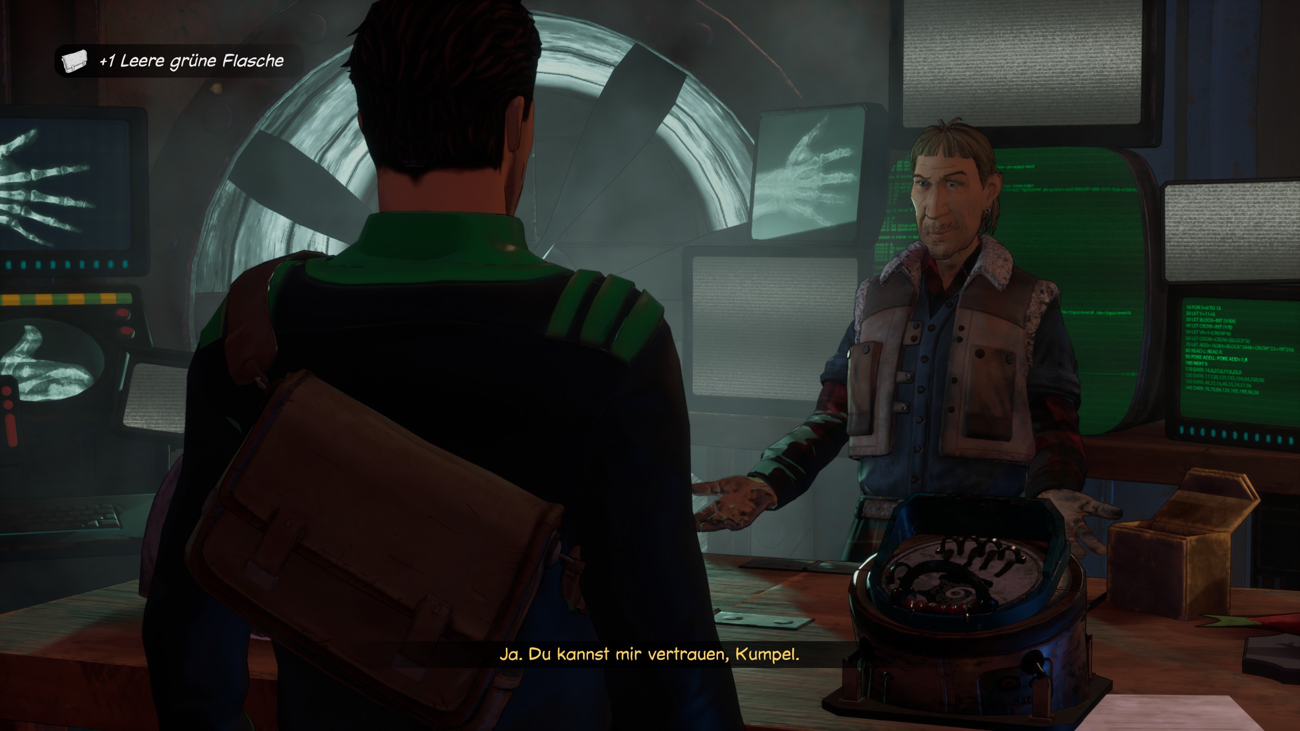 Ab hier darf der Spieler auch endlich die Kontrolle übernehmen. Mit Maus und Keyboard (WASD) oder Gamepad lenkt ihr Foster in direkter 3D-Steuerung mit Schulterblick durch das Eingangsareal, das so etwas wie das Tutorial des Spiels darstellt. Eure Aufgabe ist zunächst, herauszufinden, ob das Monster hier vorbeigekommen ist (Spoiler: Ja, ist es) und einen Weg in die Stadt zu finden. Hier findet sich zwar ein Eingang, für Personen ist dieser allerdings gesperrt, nur autorisierte Warentransporte dürfen hier durch. Hier entstehen also die ersten Rätselketten, wir treffen auf die ersten Charaktere und lernen den Umgang mit dem im späteren Verlauf noch sehr wichtigen Hacking-Werkzeug – doch dazu später mehr.